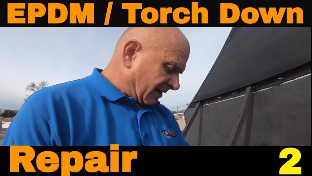 Repairing leaks on an EPDM wall to a Torch Down Roof and metal posts to rubber roof with Turbo Poly Seal. Flat Roof leaks repaired around post and columns.